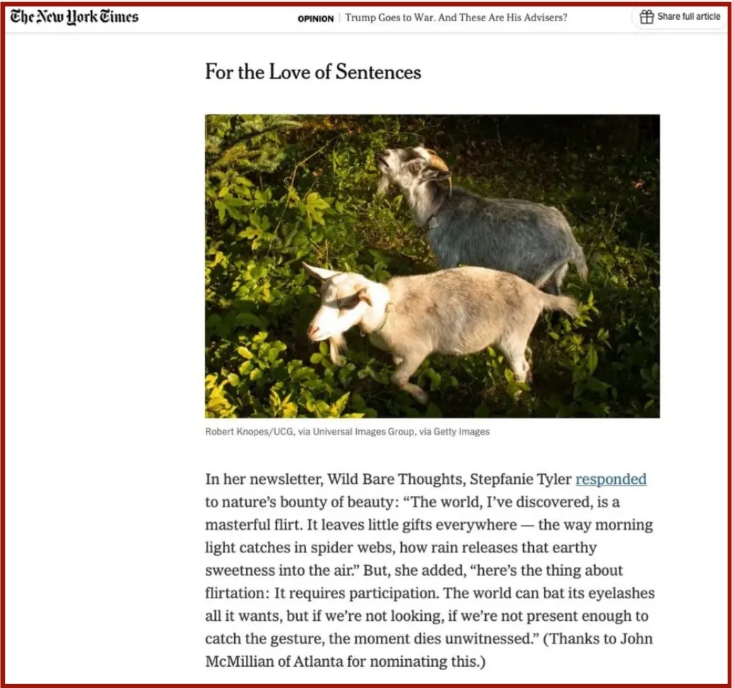 One of my essays, “flirting with the world,” was mentioned in THE NEW YORK TIMES