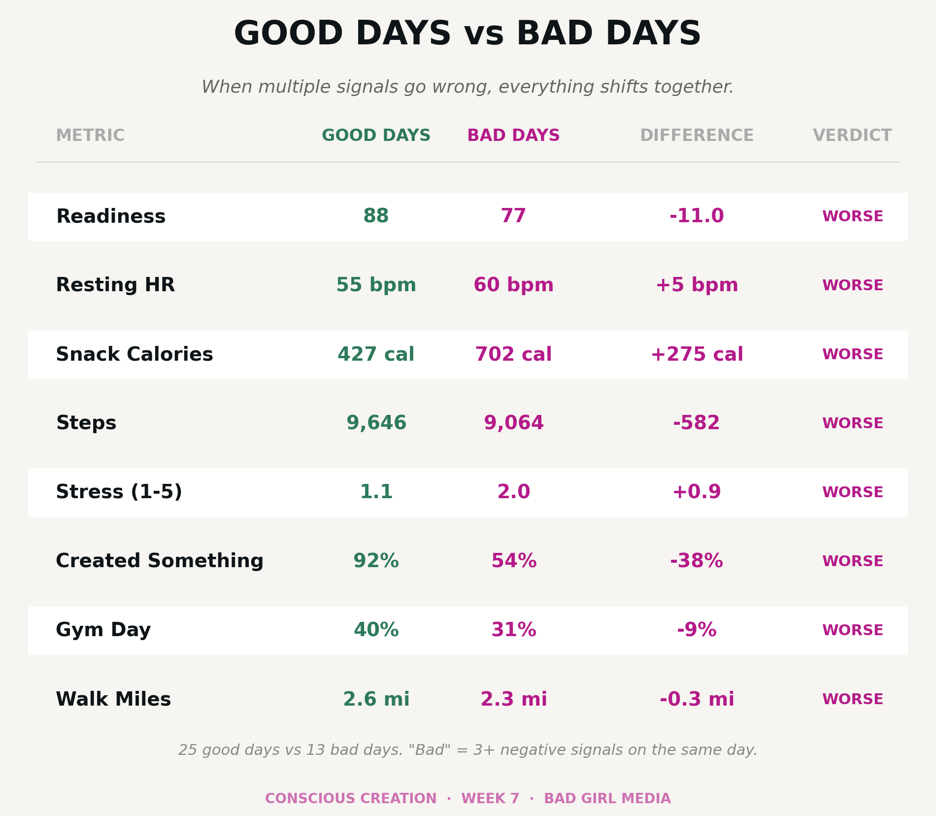Conscious Creation is a guided behavior tracking program. Every week, you get an essay that teaches you how to read your data differently, how to see correlations, identify systems, and recognize patterns you couldn’t see while living them. Plus prompts that help you use the data strategically, and frameworks for making course corrections based on what your data reveals about you.