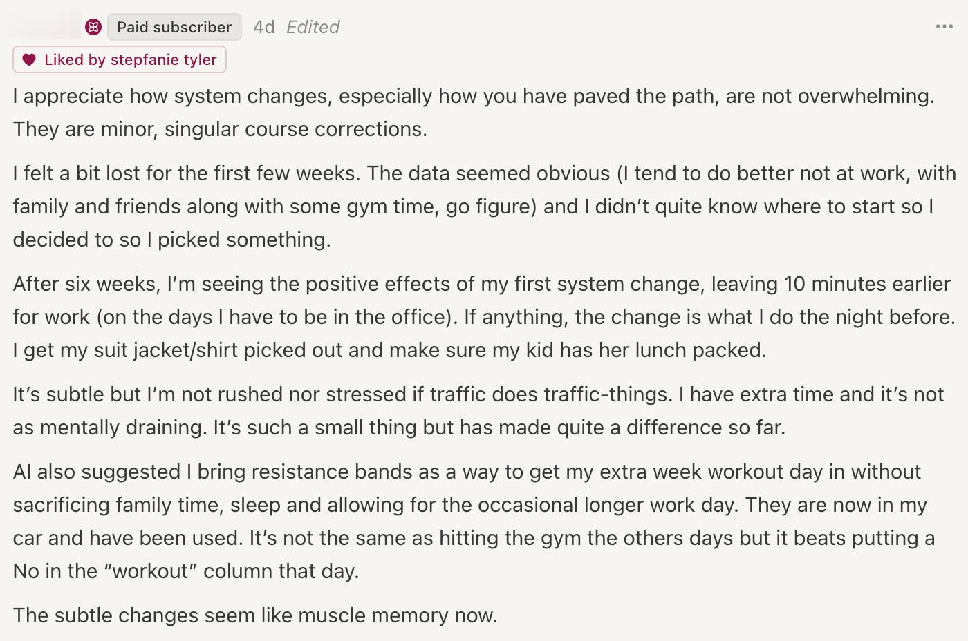But then something else happened that he definitely didn’t plan. Since he’s using AI to help him read his tracked data, it suggested that he start keeping resistance bands in his car. He’d been wanting to add an extra workout day but couldn’t figure out how to do it without cutting into family time, sleep, or the occasional long work day. Once the rest of his routine settled into this slightly calmer groove, a solution appeared, and now he’s getting a workout in on days when the gym isn’t realistic, because the resistance bands are just there in his car, ready when he needs them.