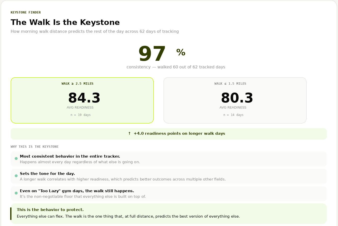[Specific keystone habit from your tracking data] Evidence: [How you know this matters — what correlations you observed]