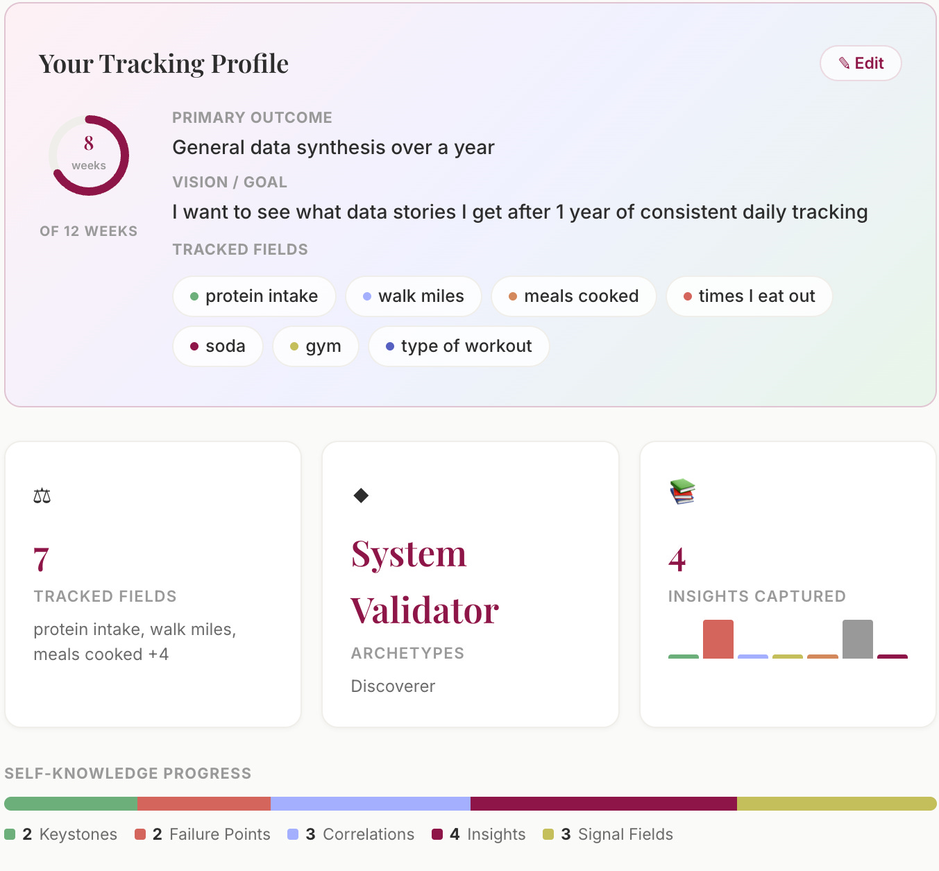 And I still believe that twelve weeks of data is better than eight. The patterns get sharper and the self-knowledge gets deeper with every additional week of data behind you.