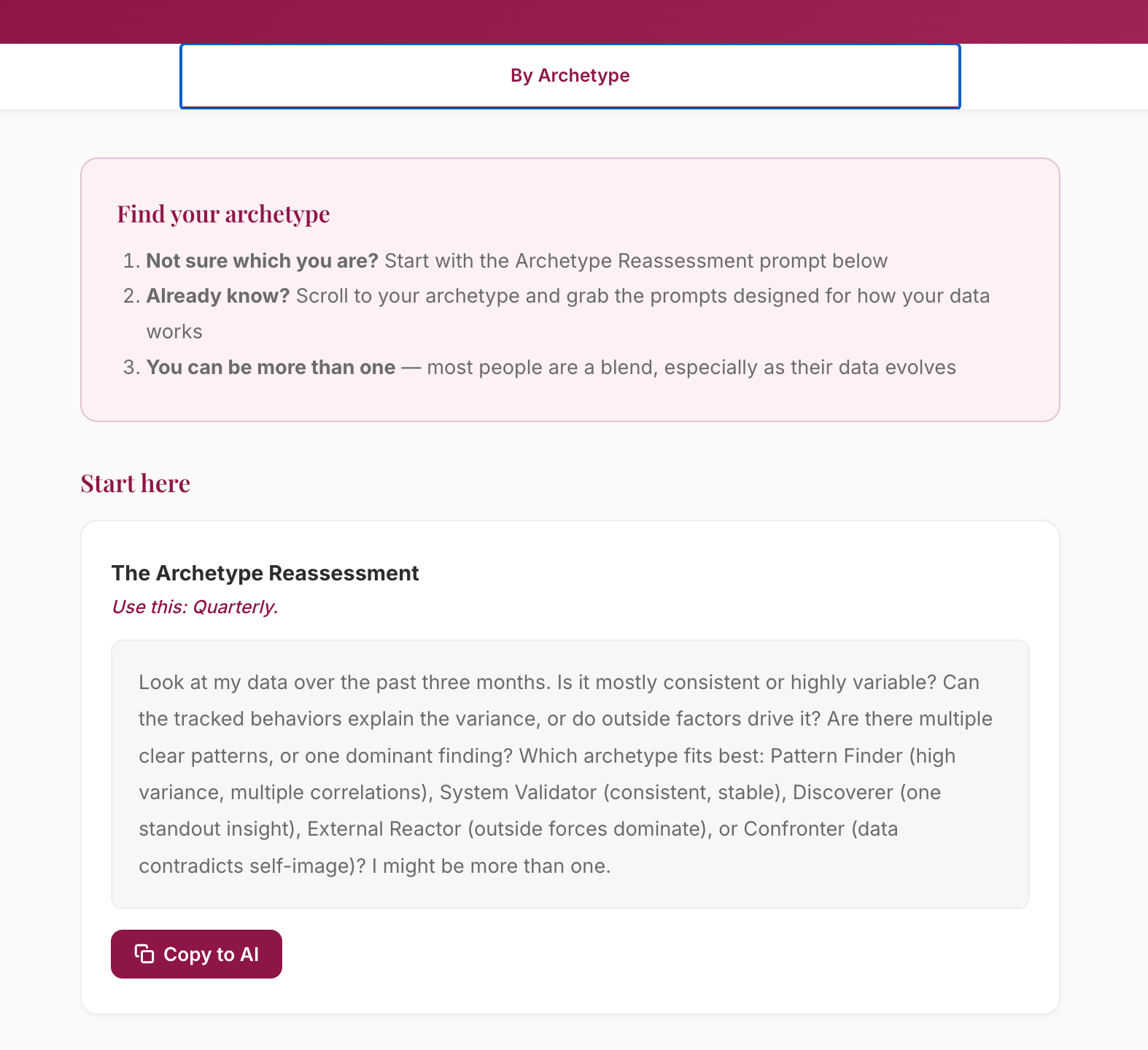 What I’m giving you below is everything you need to keep going on your own: an inventory of what you learned, a reassessment of where you are now, archetype-specific guidance for what to focus on next, the complete prompt library from the entire program, and a sustainable rhythm for checking in with your data going forward. (Plus the interactive dashboard builder that’s coming soon!)