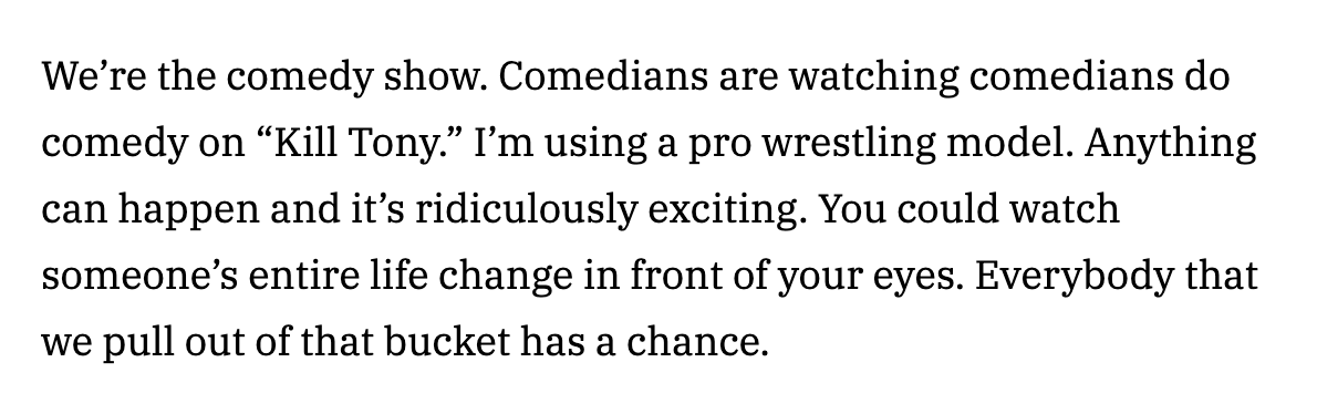 Tony's the man. There's a reason it's grown into the number one live comedy show in the world. Turns out people love meritocracy because that gets the best quality talent