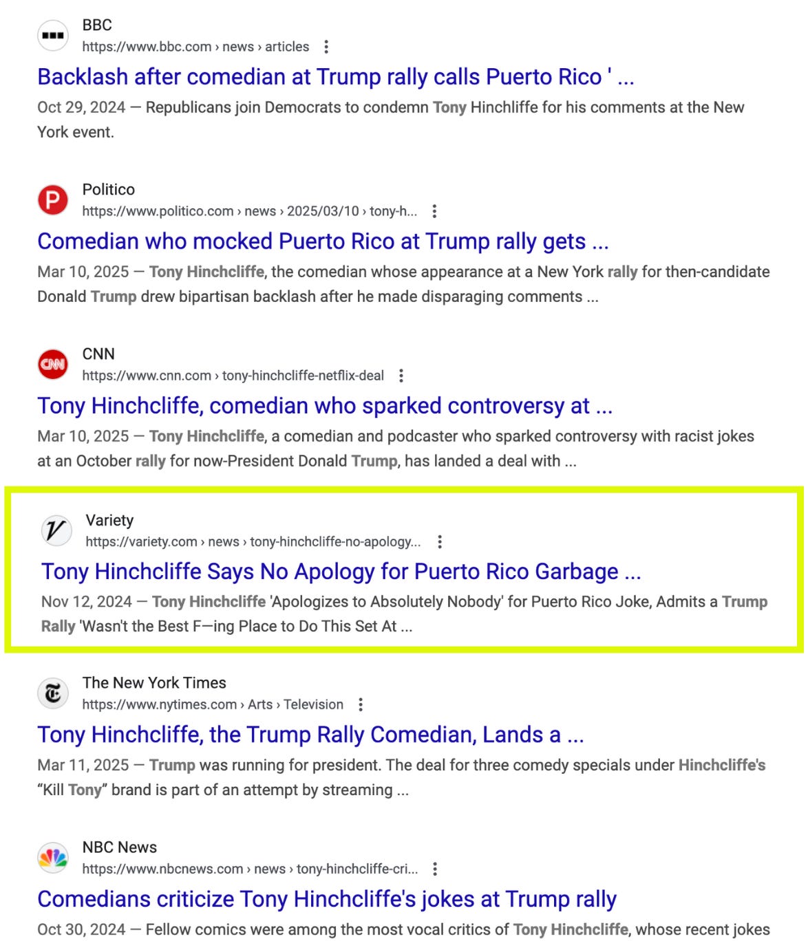 Then came the moment that changed everything: October 2024, Madison Square Garden, a Trump rally. Tony stepped to the mic and joked that Puerto Rico was "a floating island of garbage." The backlash was swift and severe—politicians condemned him, Latino groups called for boycotts, journalists wrote think pieces. The script was familiar.