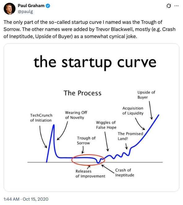 If you’ve been building anything for more than a few months, you know about what Paul Graham4 calls the “Trough of Sorrows.”5 It’s that long, grinding middle period where the initial excitement has completely worn off and the results aren’t coming fast enough, and you start to wonder if what you’re doing is actually working or if you’re just fooling yourself. I find myself in the trough every few weeks, sometimes more often than that. When I’m in it, everything feels pointless. The work that felt energizing and meaningful last month suddenly feels like pushing a boulder uphill with no end in sight. I start questioning whether I’m cut out for this at all, whether I should just get a “normal” job, whether I’m wasting my time on something that will never pan out.