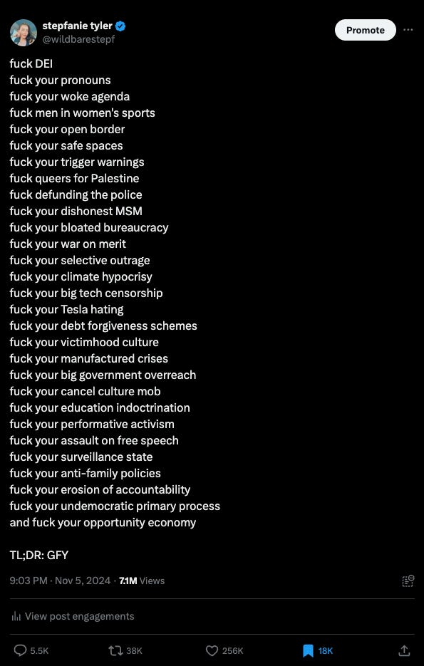 So, what exactly did I say? The tweet was a series of “fck your…” statements that called out the things that feel performative or, frankly, absurd about today’s Left. “Fck DEI,” “fck your pronouns,” “fck men in women’s sports”—each line a straightforward, unapologetic frustration with ideas that have been pushed to the forefront, often at the expense of common sense or fair discourse.