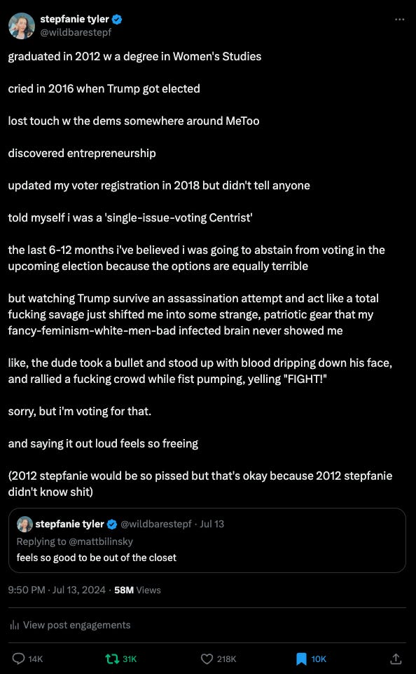 Speaking of breaking the silence and my long arc, this is the post that sorta triggered it all for me on 𝕏—Elon quote tweeted it, Rolling Stone mentioned it, I was on Fox News, etc. Truly insane to think about a timeline where I didn’t find the courage to hit “post” the night of that first assassination attempt.
