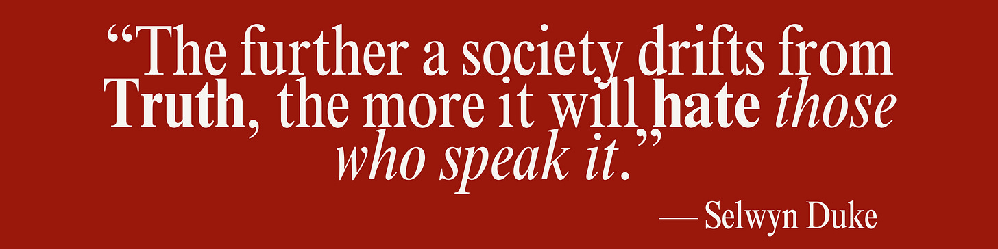 YES! LET'S GO. Not worth it to stay quiet anymore. The quote you attribute to Orwell is actually from Selwyn Duke—it's commonly misattributed. I reached out to Selwyn last week and he confirmed this is the correct wording: "The further a society drifts from Truth, the more it will hate those who speak it." :)