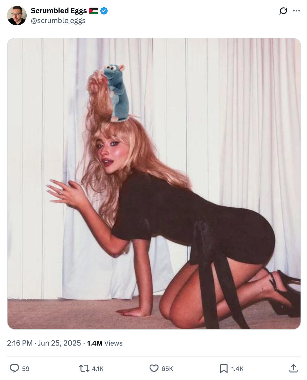 Apparently Pixar will be releasing a Ratatouille sequel? Couldn’t help but laugh at this edit of Sabrina Carpenter’s latest album cover art. (Now it’s actually art) h/t: @scrumble_eggs on 𝕏