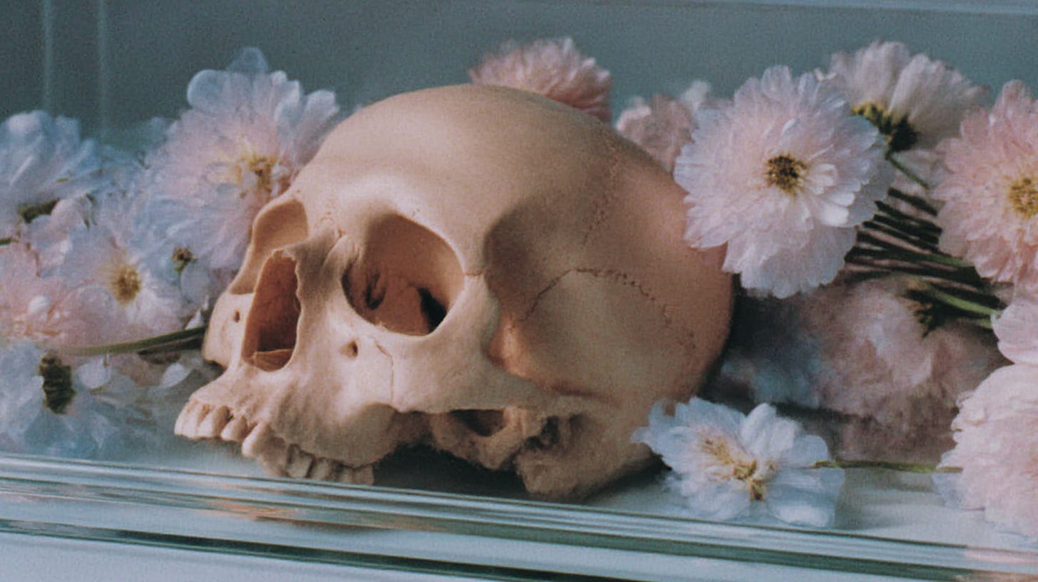 The tradition didn’t stay in Rome. It seeped into the walls of European culture for centuries. Vanitas paintings (mostly Dutch from the 16th and 17th centuries) filled canvases with skulls nestled among flowers, hourglasses beside ripe fruit, candles burned halfway down. The message was always compositional: beauty and decay held in the same frame. Because the artists understood that beauty requires the frame of death to register as beauty at all. A flower that never wilts is plastic.