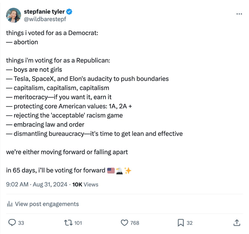 I’m voting for forward—because anything else is a step back. I’m voting for a future where we are free to think, speak, innovate, and thrive without being beholden by a bloated, overreaching state. This election isn’t just another political battle; it’s a fight for the soul of this nation. It’s a fight to preserve what makes America truly exceptional. The choice is ours, and the time is now. Let’s vote for a future that builds on truth, merit, freedom, and the audacity to be better than we were yesterday. Let’s choose to move forward—together.