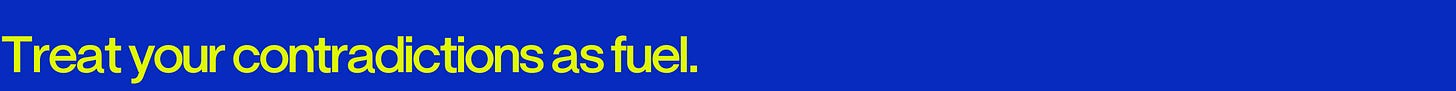 We spend so much energy trying to smooth out our edges to present a coherent self to the world, but the most interesting people live in the tension between opposing forces. Your spirituality and your skepticism, your ambition and your desire for stillness, your femininity and your intellect. The Muses themselves represented different domains that sometimes contradicted each other—epic poetry and comedy, astronomy and dance. They contained multitudes, and so do you! Don’t try to resolve these tensions into something neat and marketable because the paradox is what makes you compelling.