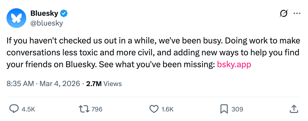Bluesky recently made a post about how they’ve been “working hard” to make their platform “less toxic,” which in practice means less of the speech they find uncomfortable. I’m not naive about how these decisions get made, and I’m not interested in debating specific platforms here, but I do think it’s a symptom of something real. We’ve built an entire media infrastructure around the idea that being challenged is harm, and we’re shocked that people have stopped knowing how to be challenged.