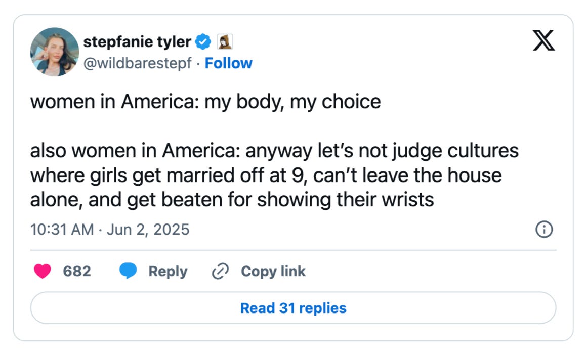 This isnât multiculturalism. Itâs selective blindness. A culture that forces women to cover up or be punished is not empoweringâitâs controlling. And excusing it under the guise of tolerance reveals the leftâs inability to hold all cultures to the same moral standard.