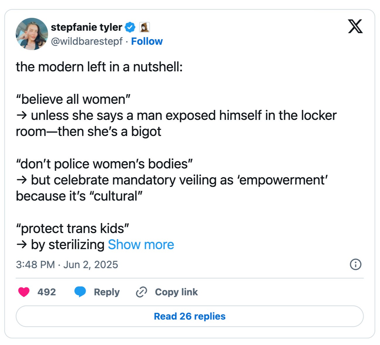 Because when you actually examine these slogansââbelieve all women,â âdonât police womenâs bodies,â âprotect trans kidsâ, etc.âthey donât hold up. Not consistently. Not logically. What you find beneath them isnât clarity, but selective outrage and manufactured consensus. A framework that only works when no one asks questions.