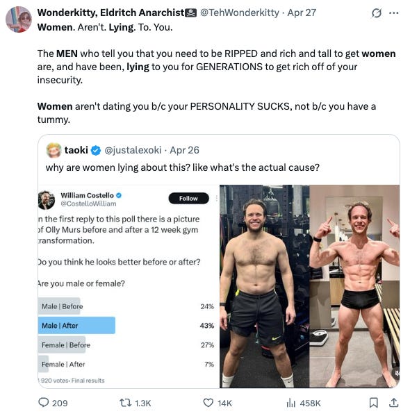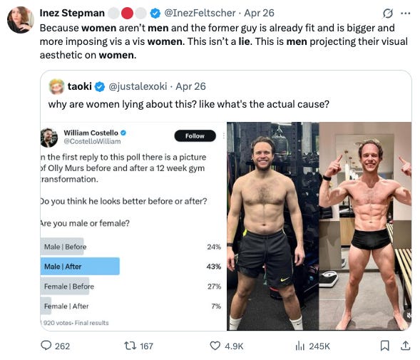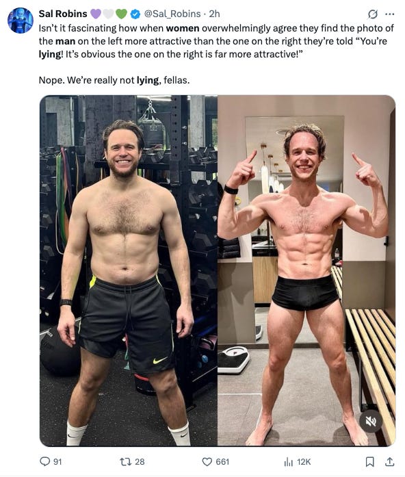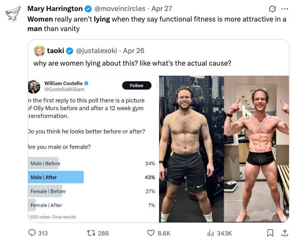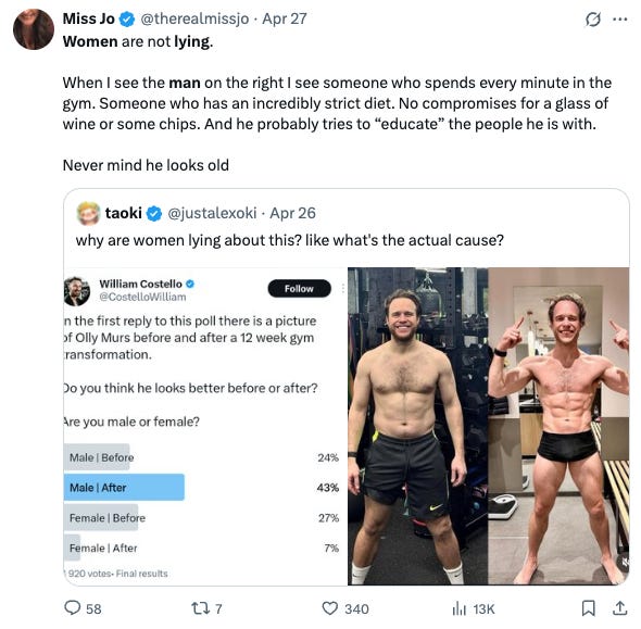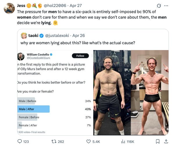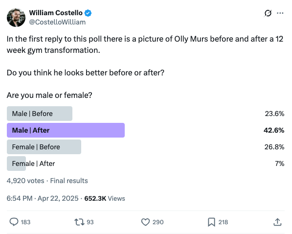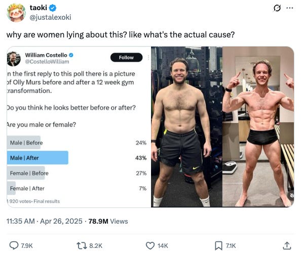 If you spent even ten minutes on 𝕏 last weekend, you saw the Olly Murs transformation shot—soft-core Olly on the left, twelve-week ab-bot on the right. By Monday morning, my feed was totally saturated. Paired with various polls from around the internet, a full-blown culture war had broken out over the British pop-star’s 12-week transformation.