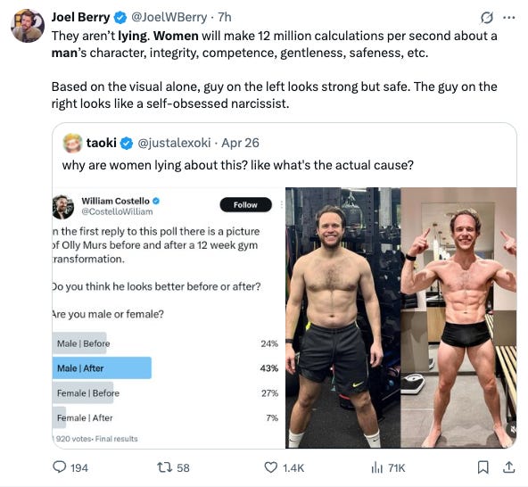 The guy in the “before” photo still carries that old-world signal. He looks strong enough to pick you up and toss you over his shoulder or build a shelter if he had to, but not so engineered that you wonder if he’s worried about his diet in the middle of a crisis. The “after” photo definitely looks impressive. But it also crosses into something more self-referential. It’s a body that’s become the project itself. And for a lot of women, even if they respect it, it’s just not as compelling.