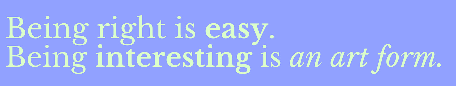 If being interesting is so much more valuable, why are we so obsessed with being right? Because being right feels safe. It makes the ego buzz. It gives the illusion of some kind of mental superiority.