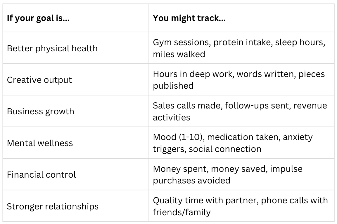 Before you build your tracker, you need to know what goes in it. In order to get the most out of Conscious Creation, the goal isn’t to copy someone else’s template, it’s getting clear on what YOU actually care about, then translating that into things you can measure.